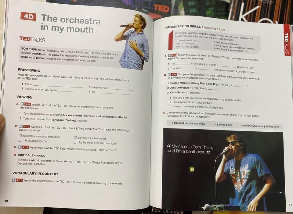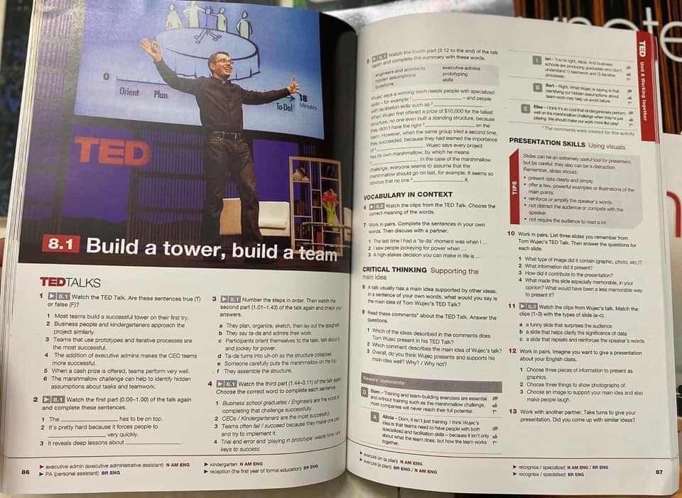 Mỗi bài có các bài tập đặc biệt cho kỹ năng thuyết trình (kỹ năng nói) và giao tiếp (giao tiếp bằng miệng)